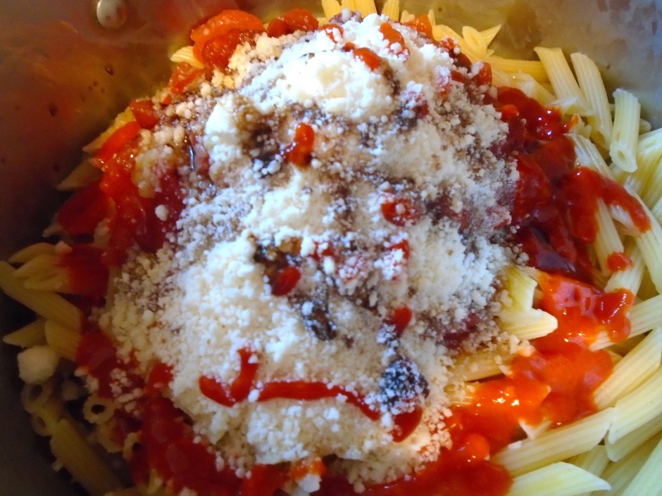 Petti Di Pollo Alla Fiorentina ← Previous Next → meanwhile, saute freshly cooked penne in garlic-oil, add chopped tomatoes, grated parmesan, sriracha, kosher salt and maggi seasoning (optional), mix well