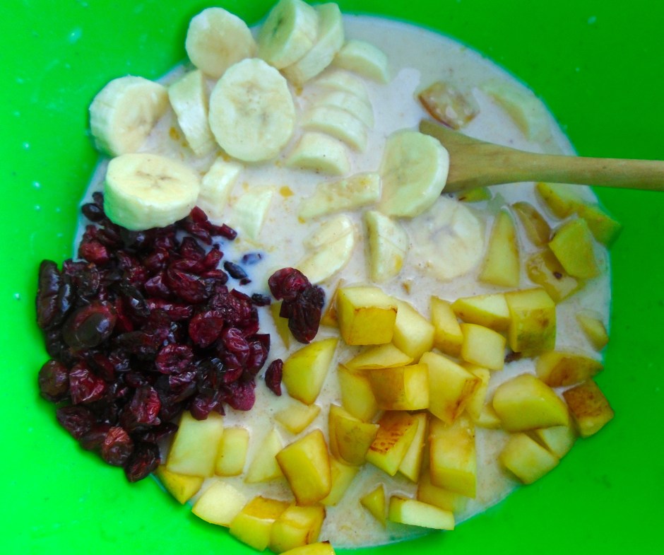 Cinnamon Roll And Fruit-Pudding ← Previous Next → add apples, bananas and a generous handful of dried cranberries