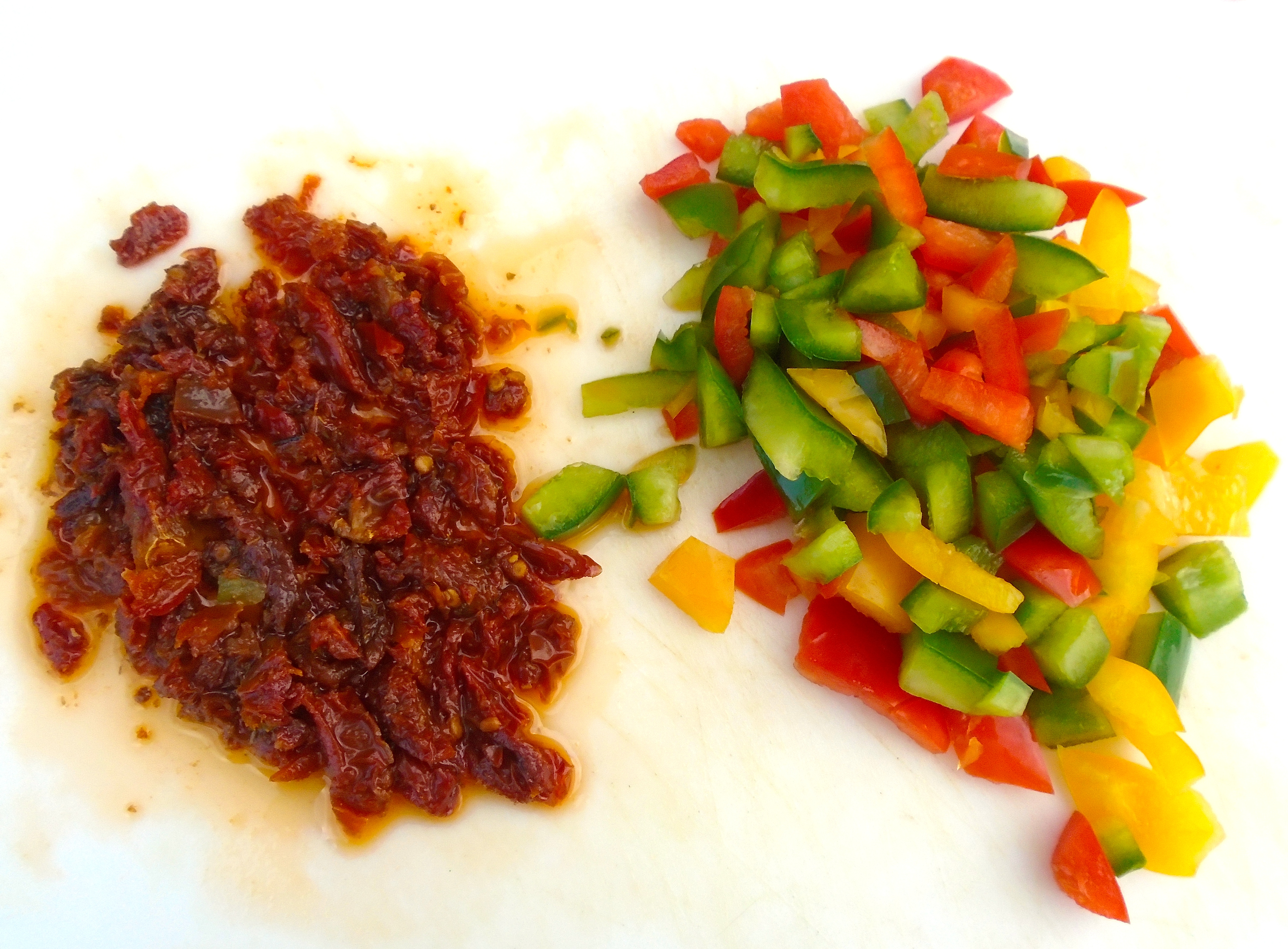 Beef Kebob With Rainbow Puree ← Previous Next → chop the peppers-trimmings into coarse pieces, chop oil-preserved sun-dried tomatoes coarsely