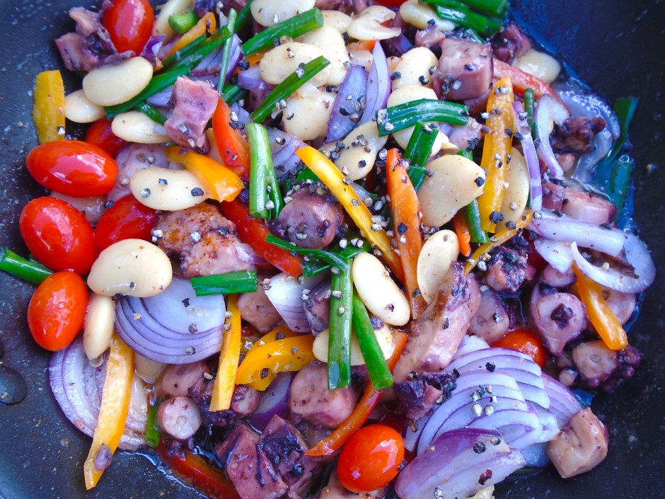 Romaine, Octopus And Bean Salad ← Previous Next → add vegetables, saute 2 minutes, season with salt, fresh oregano and freshly ground black pepper