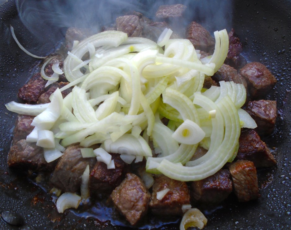 Beef And Bean Burrito ← Previous Next → saute in a VERY hot pan, add sliced onions, cook until meat is browned on the outside and still very rare on the inside