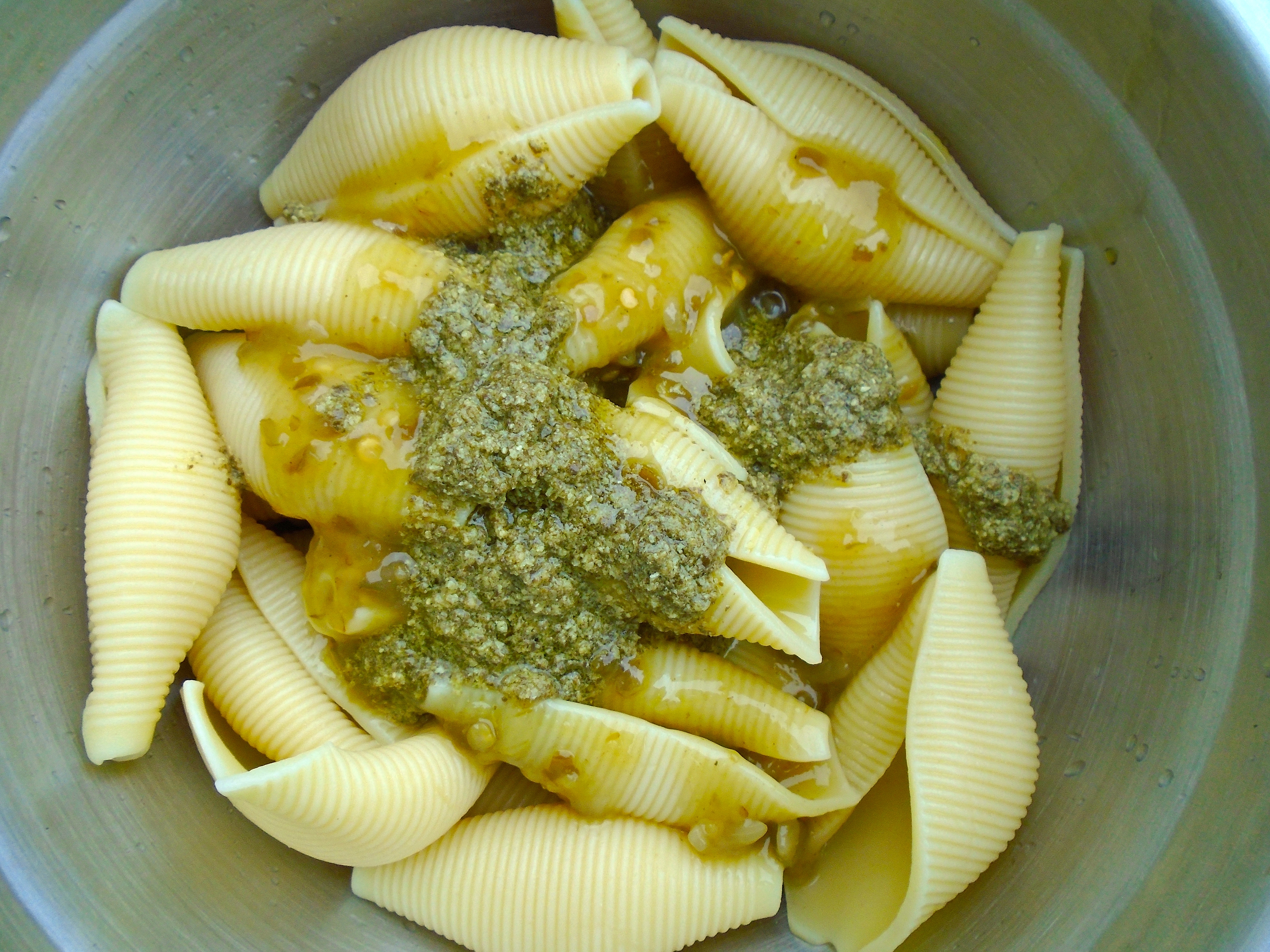 Pasta Salad With Salmon, Shrimp And Pesto ← Previous Next → add pesto, white balsamic vinegar and a dash of maggi seasoning to fresh cooked pasta shells, mix, check / adjust seasoning, add grape tomatoes and seafood