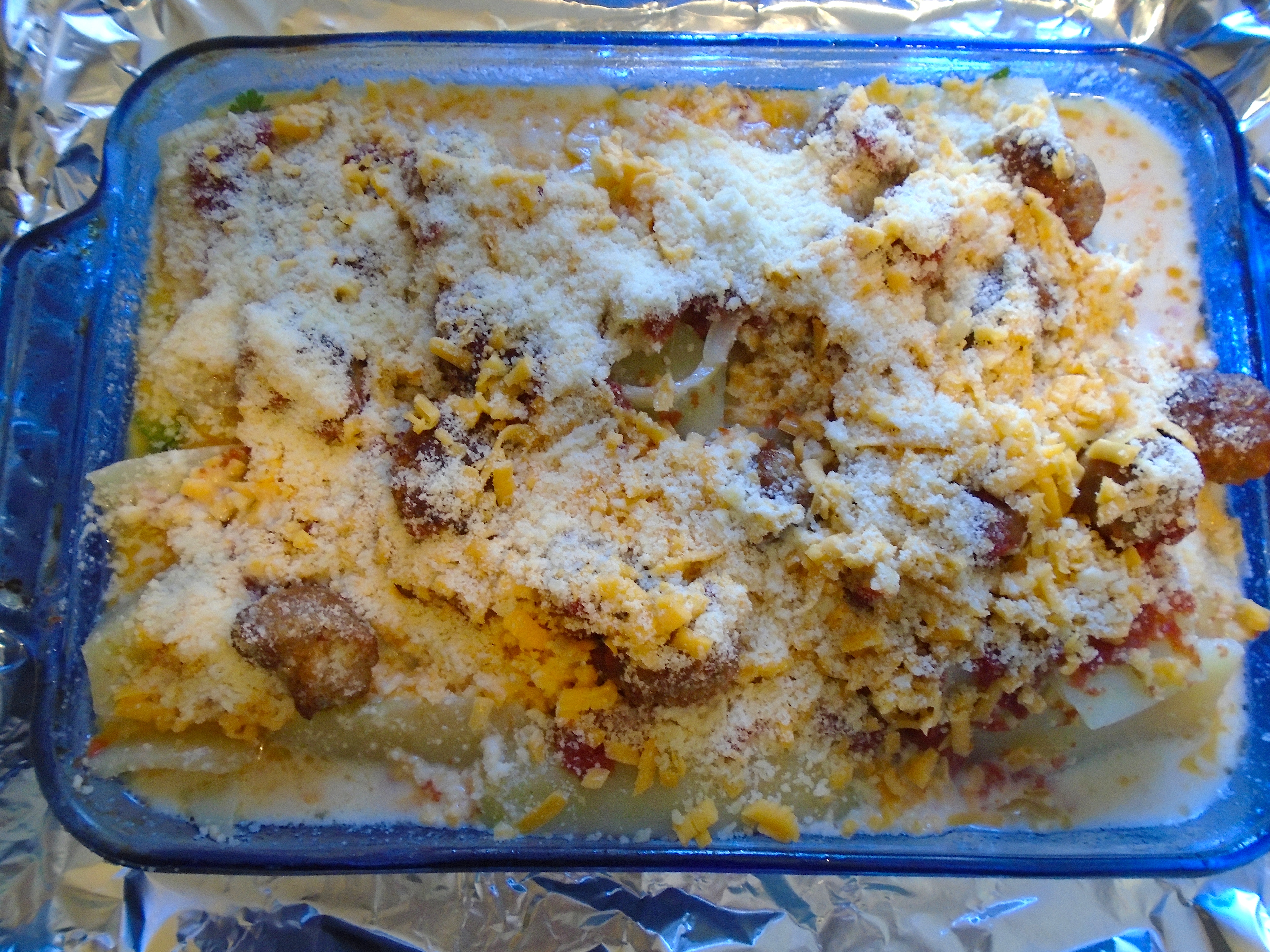 Potato And Meatballs Lasagna ← Previous Next → add one cup of milk seasoned with kosher salt and cayenne pepper, bake at 320F for one hour