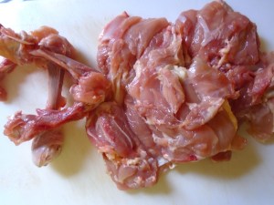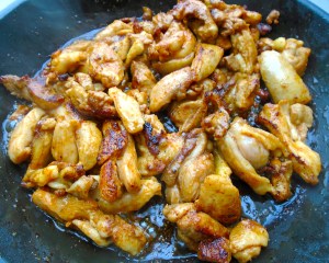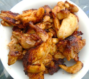 - cut chicken into strips, season with kosher salt, granulated garlic and finely chopped chipotle in salsa