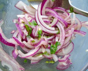 - pickle sliced red onions with lime juice, kosher salt, cayenne pepper and chopped cilantro