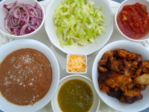 pickled onions, shredded lettuce, re-fried beans, spicy tomatillo salsa, chipotle chicken, salsa Mexicana, shredded cheese, tortillas