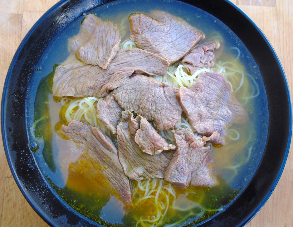 ladle simmering stock over beef