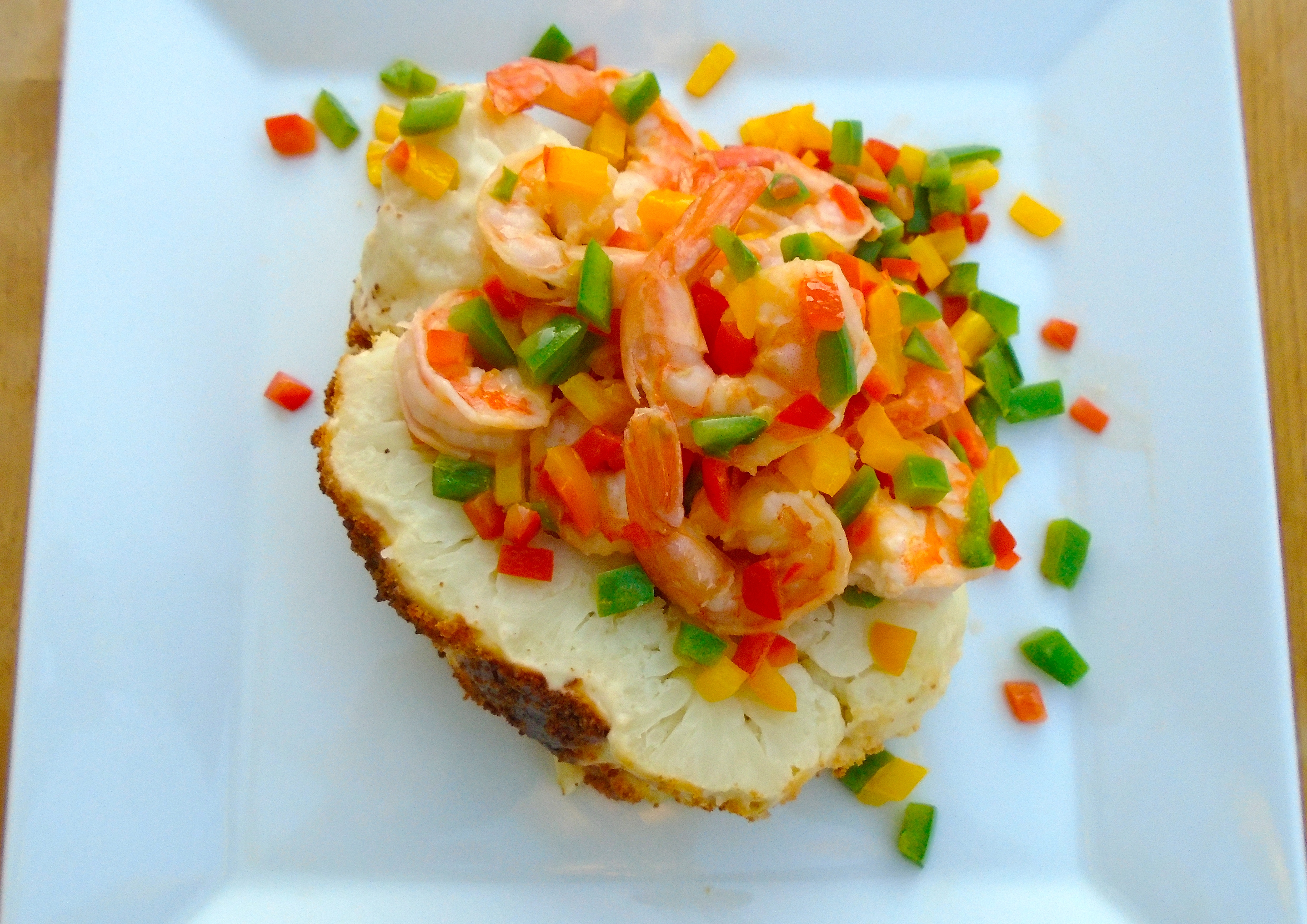 Baked Cauliflower & Confetti Shrimp ← Previous Next → slice the cauliflower into thick slices, top with the shrimp and lots of butter