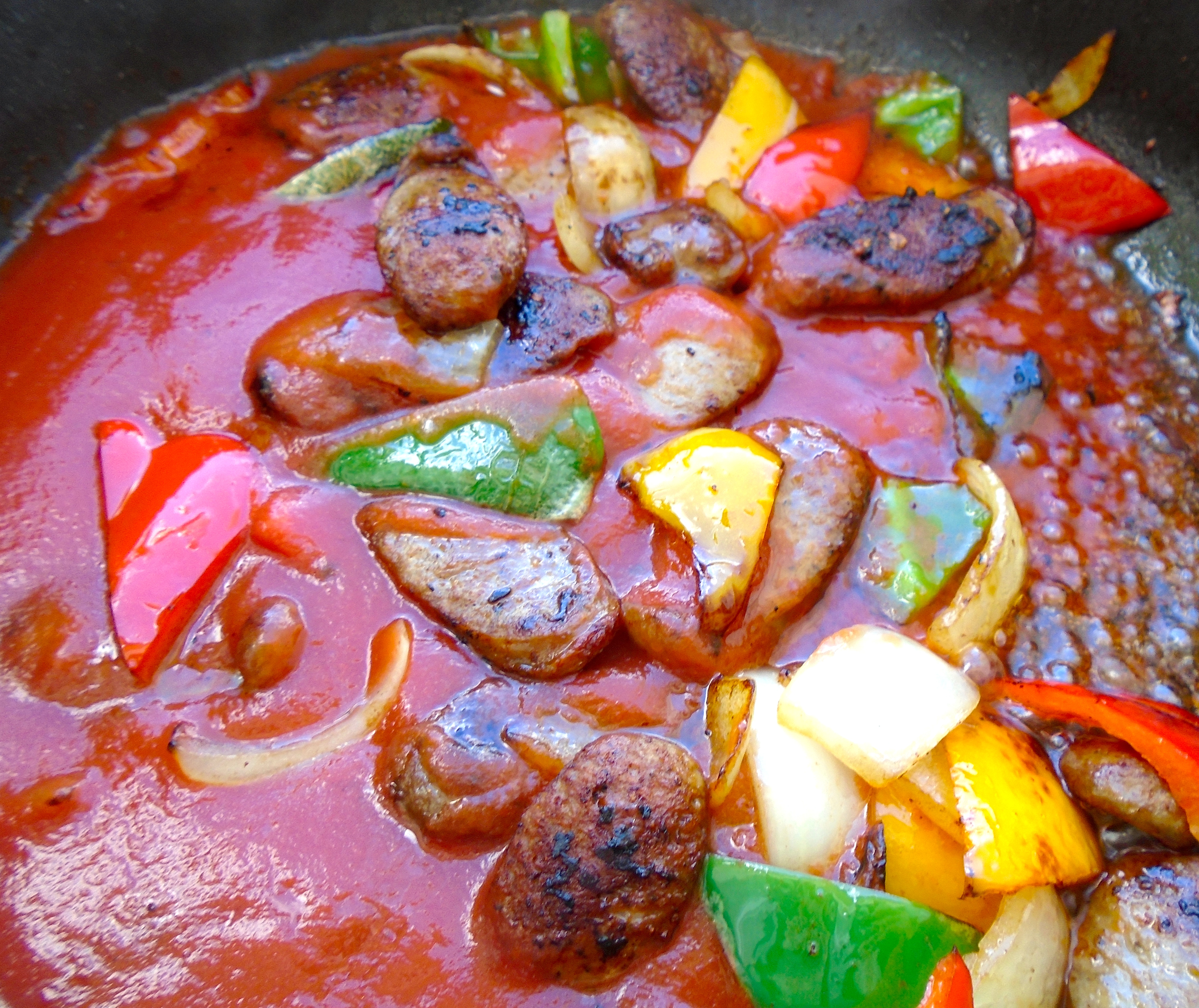 Easy Does It # 32 – Italian-Style Sausage and Peppers ← Previous Next → add GOOD QUALITY (preferably freshly made) tomato sauce, fresh basil and oregano, simmer for three minutes, check / adjust seasoning