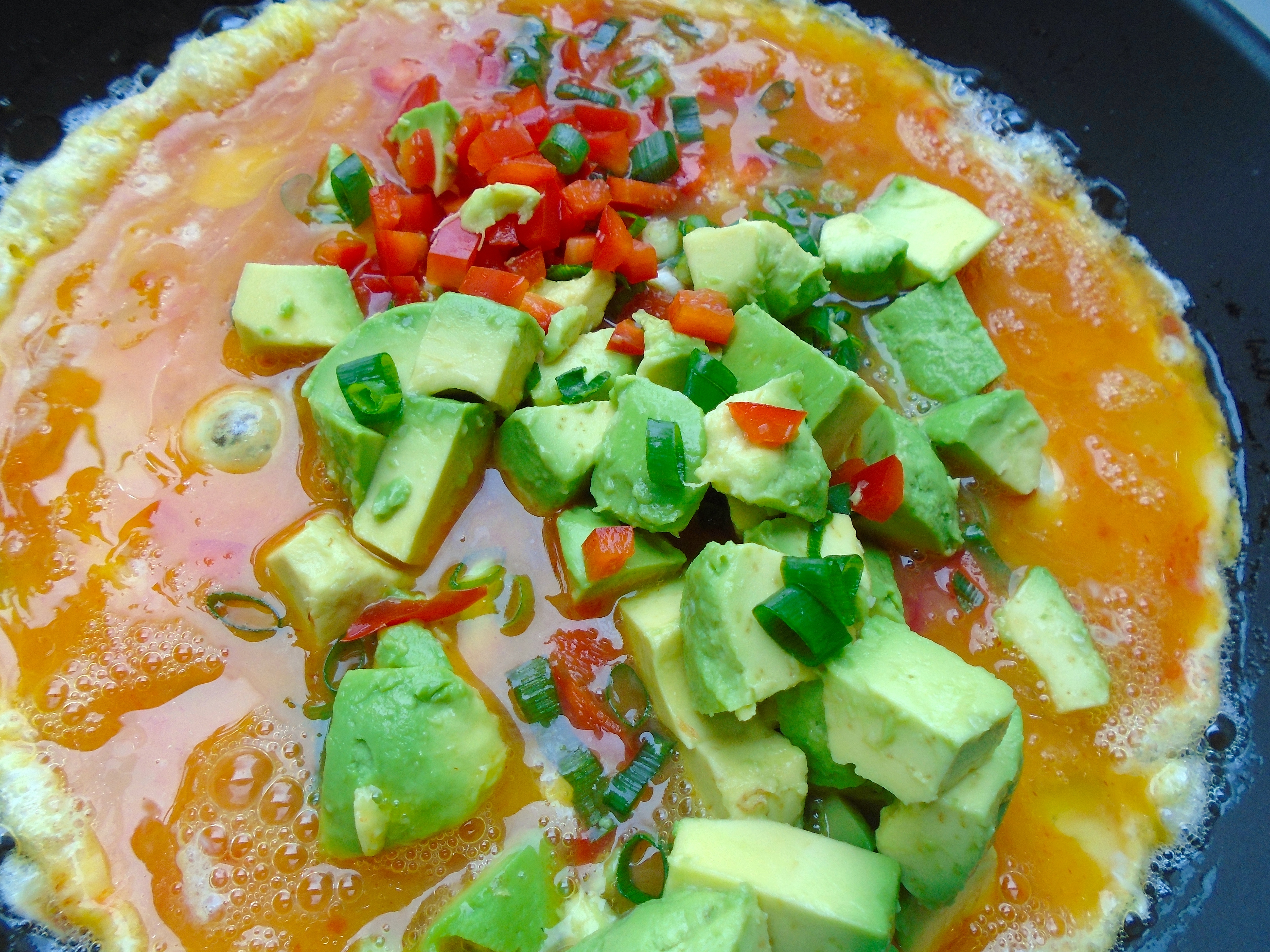 Breakfast Of Champions # 33 – Burrito With Scrambled Eggs, Refried Beans And Avocado ← Previous Next → scramble eggs in med-hot pan with butter or olive oil, when starting to set, add diced peppers, avocado and sliced scallions