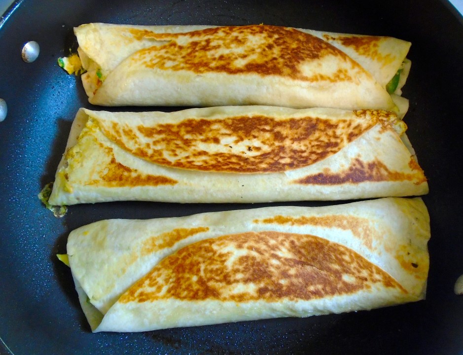 Breakfast Of Champions # 33 – Burrito With Scrambled Eggs, Refried Beans And Avocado ← Previous Next → saute burritos in lightly oiled pan until golden, to serve, top with sour cream and more scallions and pair with a small salad or fruits
