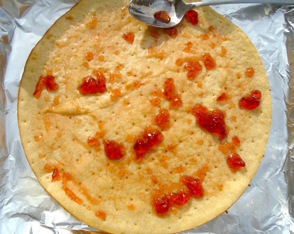spread strawberry preserve on pre-baked pizza dough