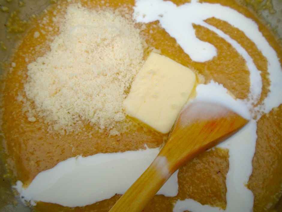 Cheese Polenta With Spicy Italian Sausage And Poached Egg ← Previous Next → add grated cheese of your choice (I used Parmesano Reggiano), butter and heavy cream, check/adjust seasoning