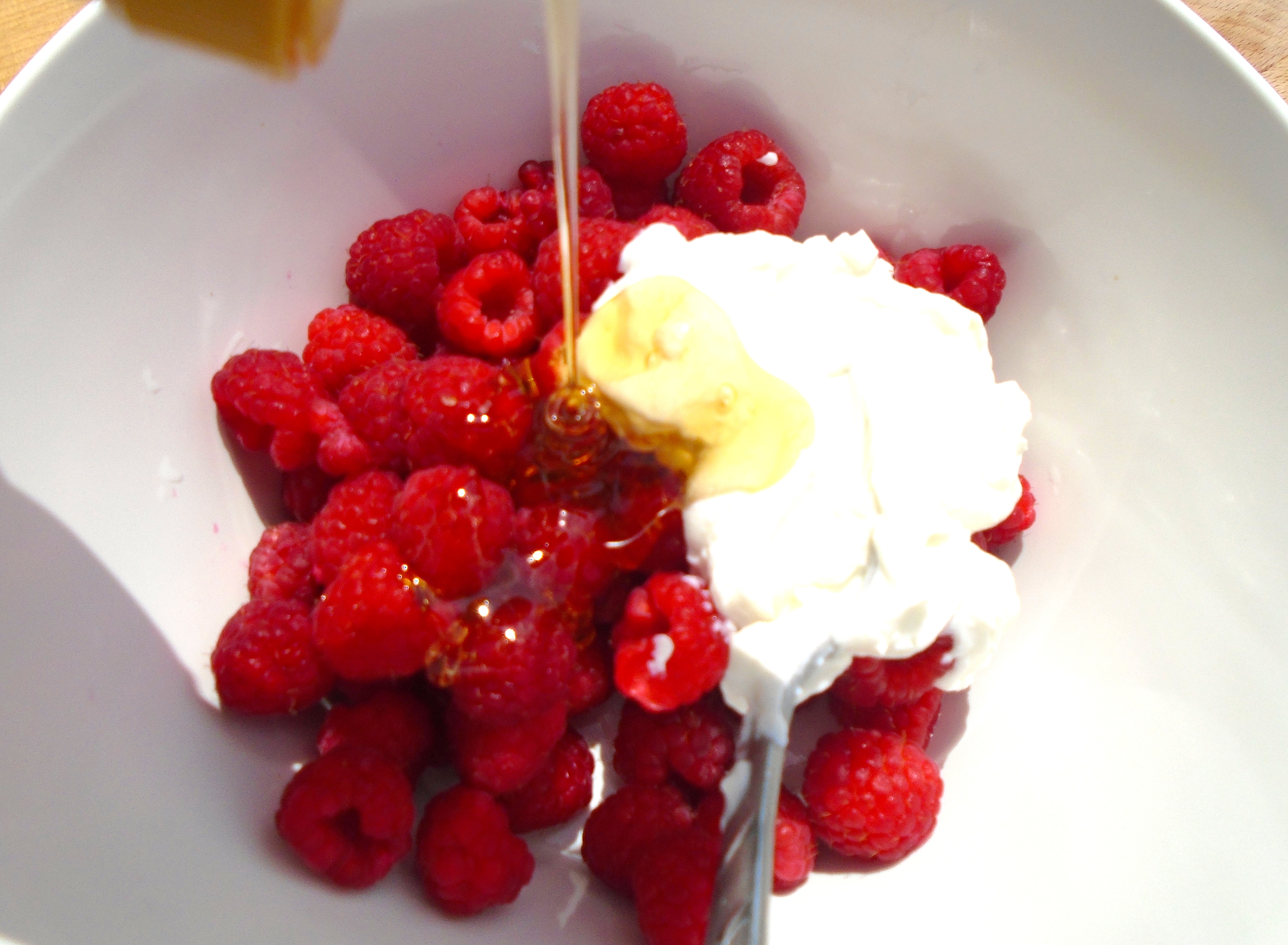 Belgian Buttermilk Waffles With Fresh Raspberries, Yogurt And Honey Next → mix fresh raspberries, Greek yogurt, honey, vanilla extract and a dash of lime juice
