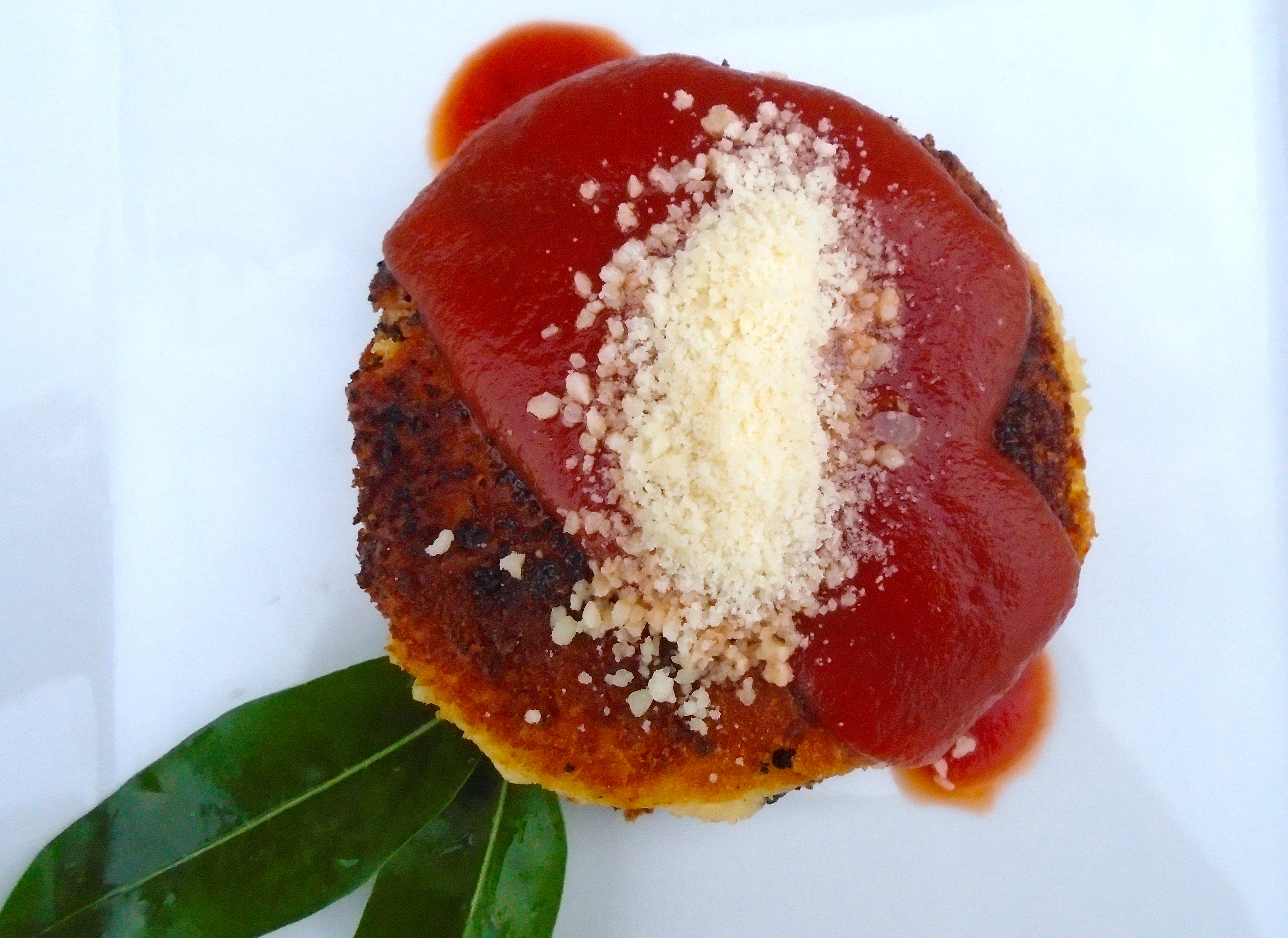 Parmesan-Crusted Chicken Tights With Potato Patty And Cilantro/Lime Dressing ← Previous Next → plate patty, nape with tomato sauce, sprinkle with parmesan