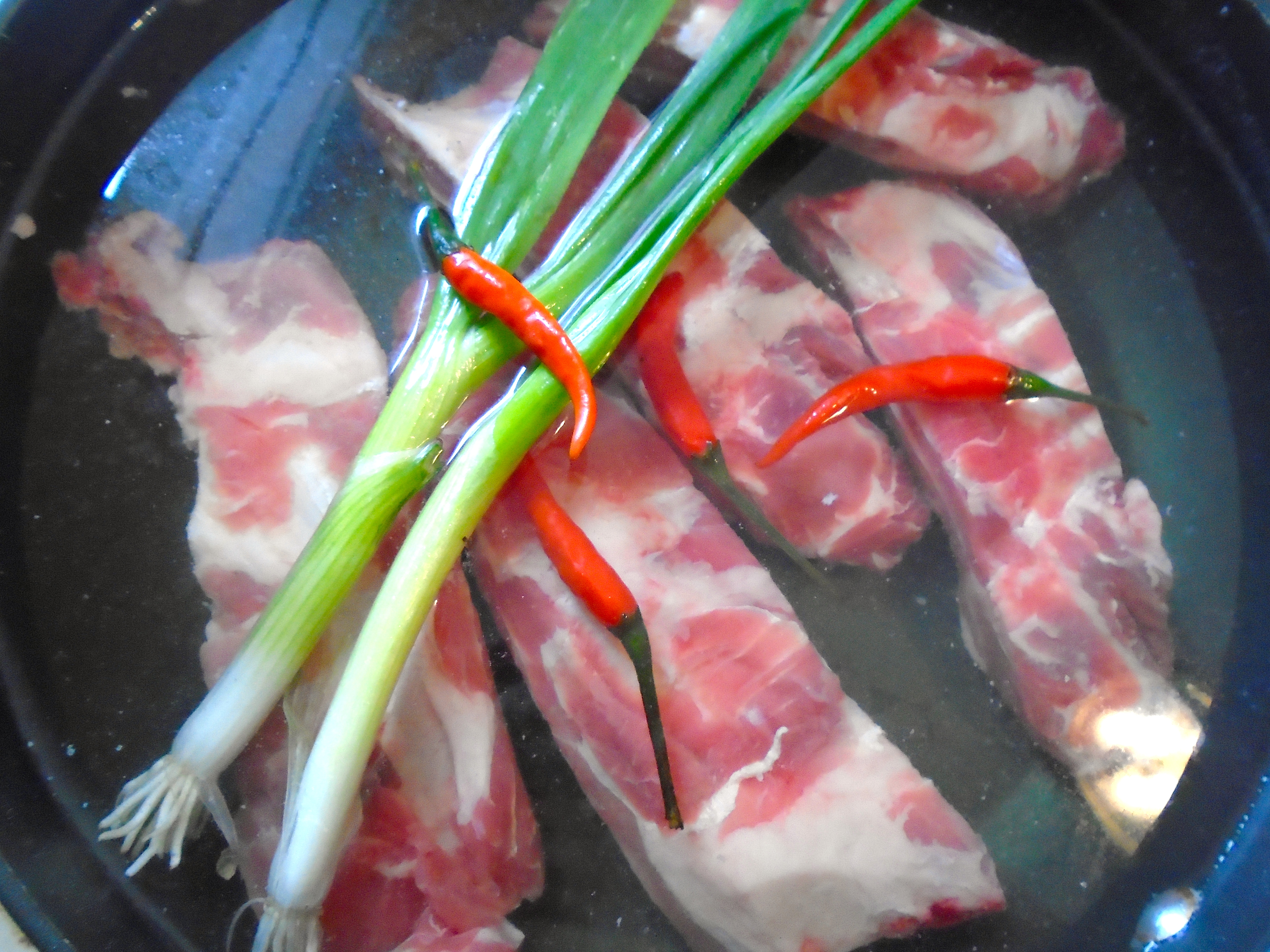 Korean Inspired Beef Stew ← Previous Next → blanch beef ribs, drain and rinse, add cold water, chilies, scallions, kosher salt, grated ginger and garlic paste, simmer until ribs are tender but not falling apart