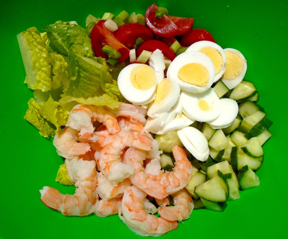Shrimp & Vegetable Salad In Yogurt/Honey Dressing With Grilled Jalapeno/Garlic Bread Next → shrimp, cucumbers, tomatoes, romaine lettuce, hard-boiled eggs