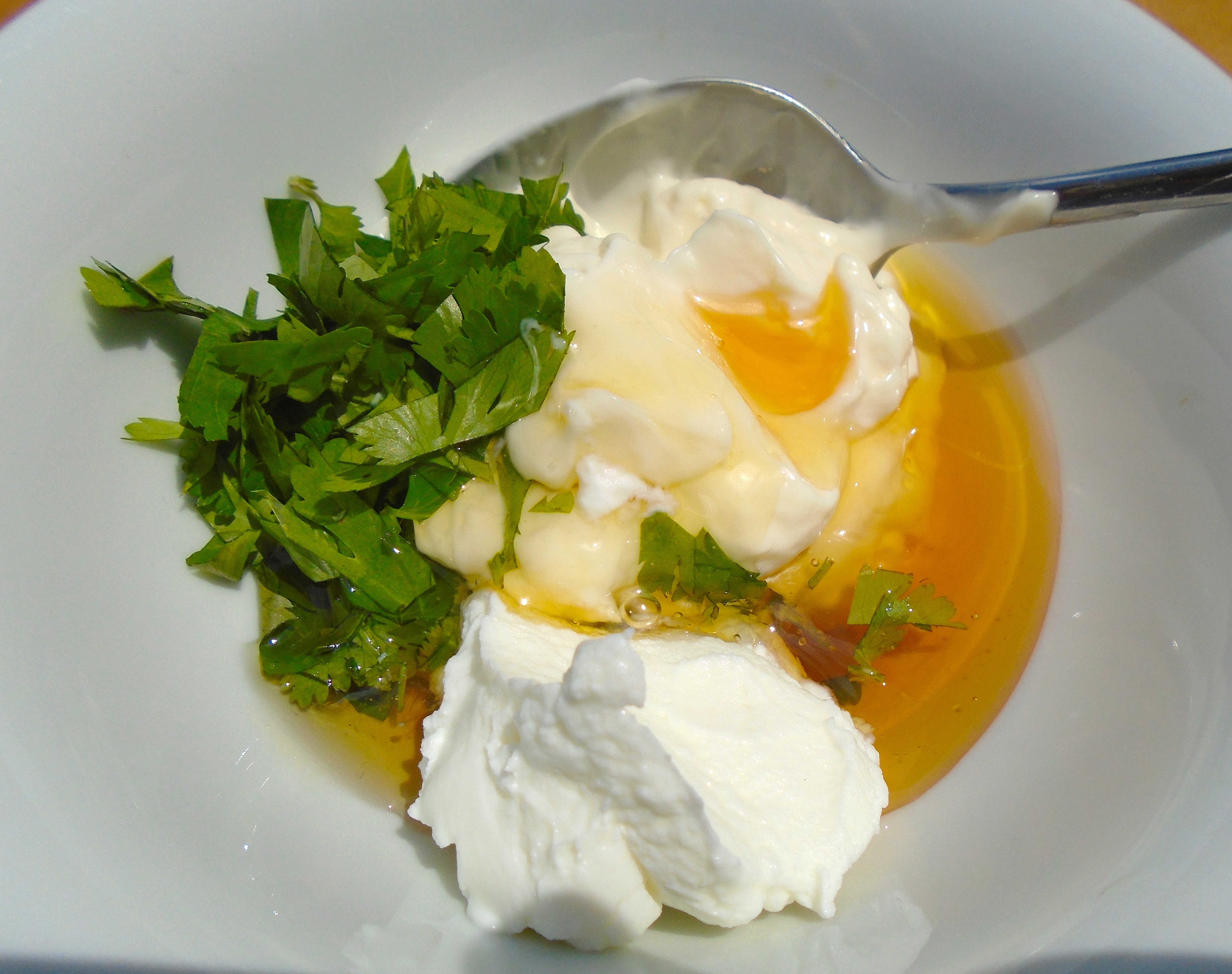 Shrimp & Vegetable Salad In Yogurt/Honey Dressing With Grilled Jalapeno/Garlic Bread ← Previous Next → for the dressing, mix mayo, greek yogurt, honey, kosher salt, cayenne pepper and chopped cilantro