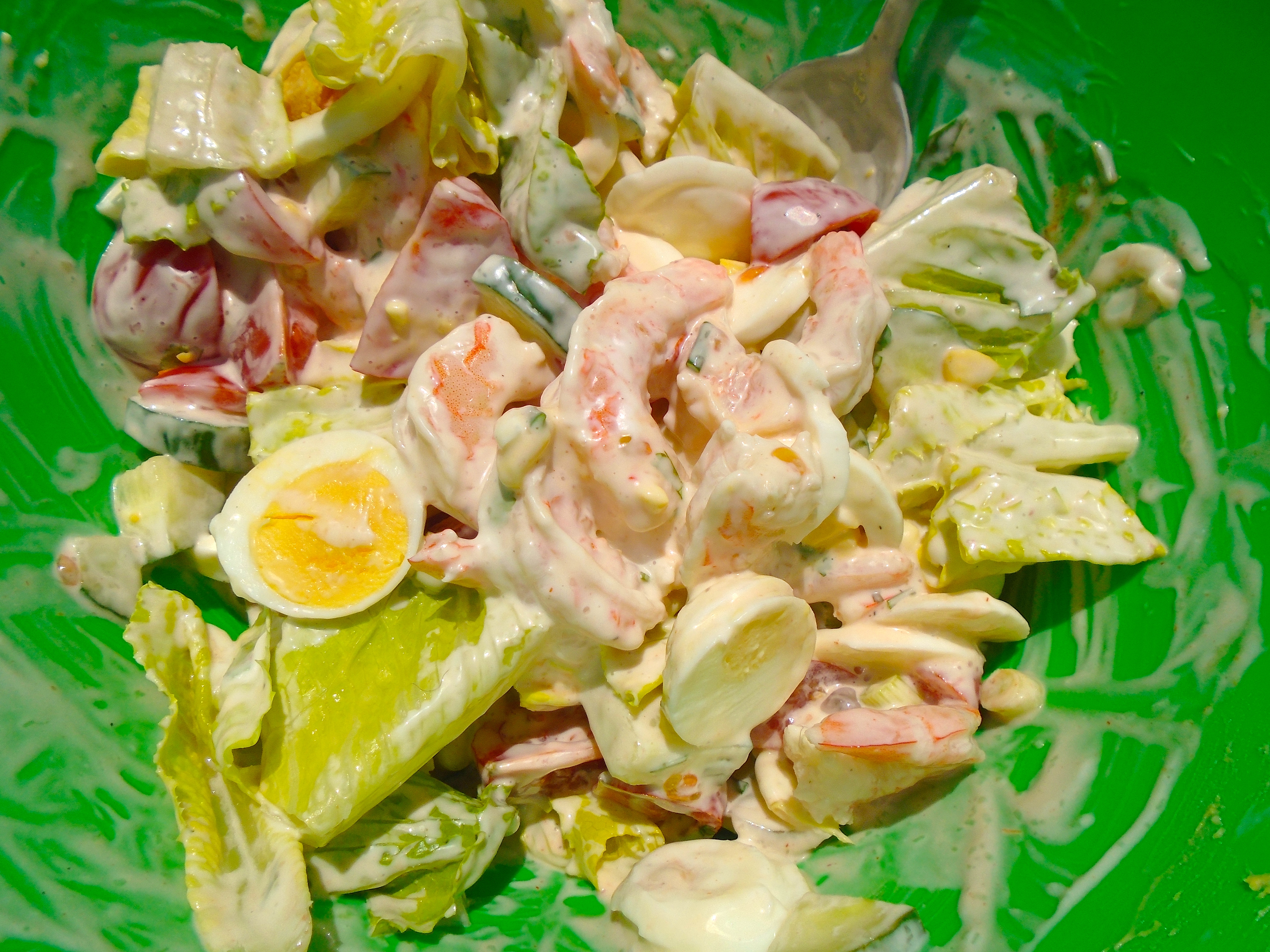 Shrimp & Vegetable Salad In Yogurt/Honey Dressing With Grilled Jalapeno/Garlic Bread ← Previous Next → add dressing to other salad-ingredients, mix carefully
