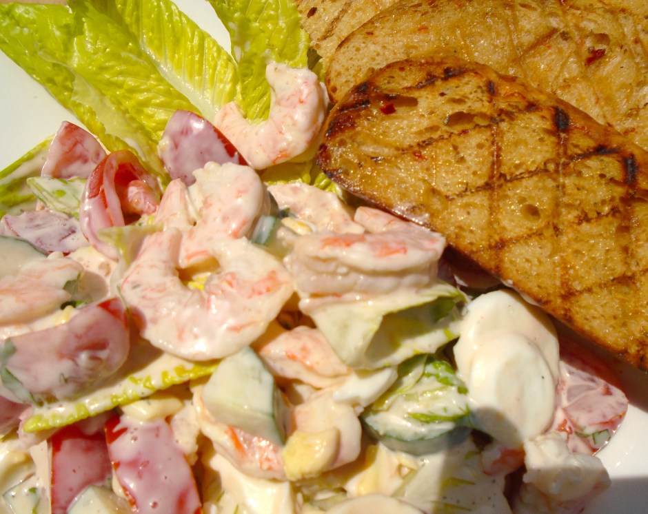 Shrimp & Vegetable Salad In Yogurt/Honey Dressing With Grilled Jalapeno/Garlic Bread ← Previous Next → Shrimp, Egg & Vegetable Salad In Yogurt/Honey Dressing With Grilled Jalapeno/Garlic Bread