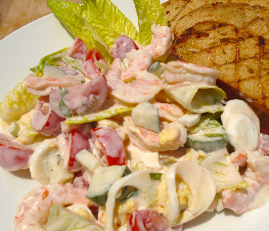 Shrimp & Vegetable Salad In Yogurt/Honey Dressing With Grilled Jalapeno/Garlic Bread ← Previous Next → Shrimp, Egg & Vegetable Salad In Yogurt/Honey Dressing With Grilled Jalapeno/Garlic Bread