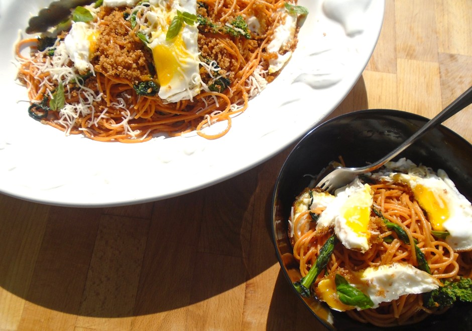 Tomato Spaghetti With Broccolini, Crispy Fried Eggs And Pangrattato ← Previous Next → Tomato Spaghetti With Broccolini, Crispy Fried Eggs And Pangrattato