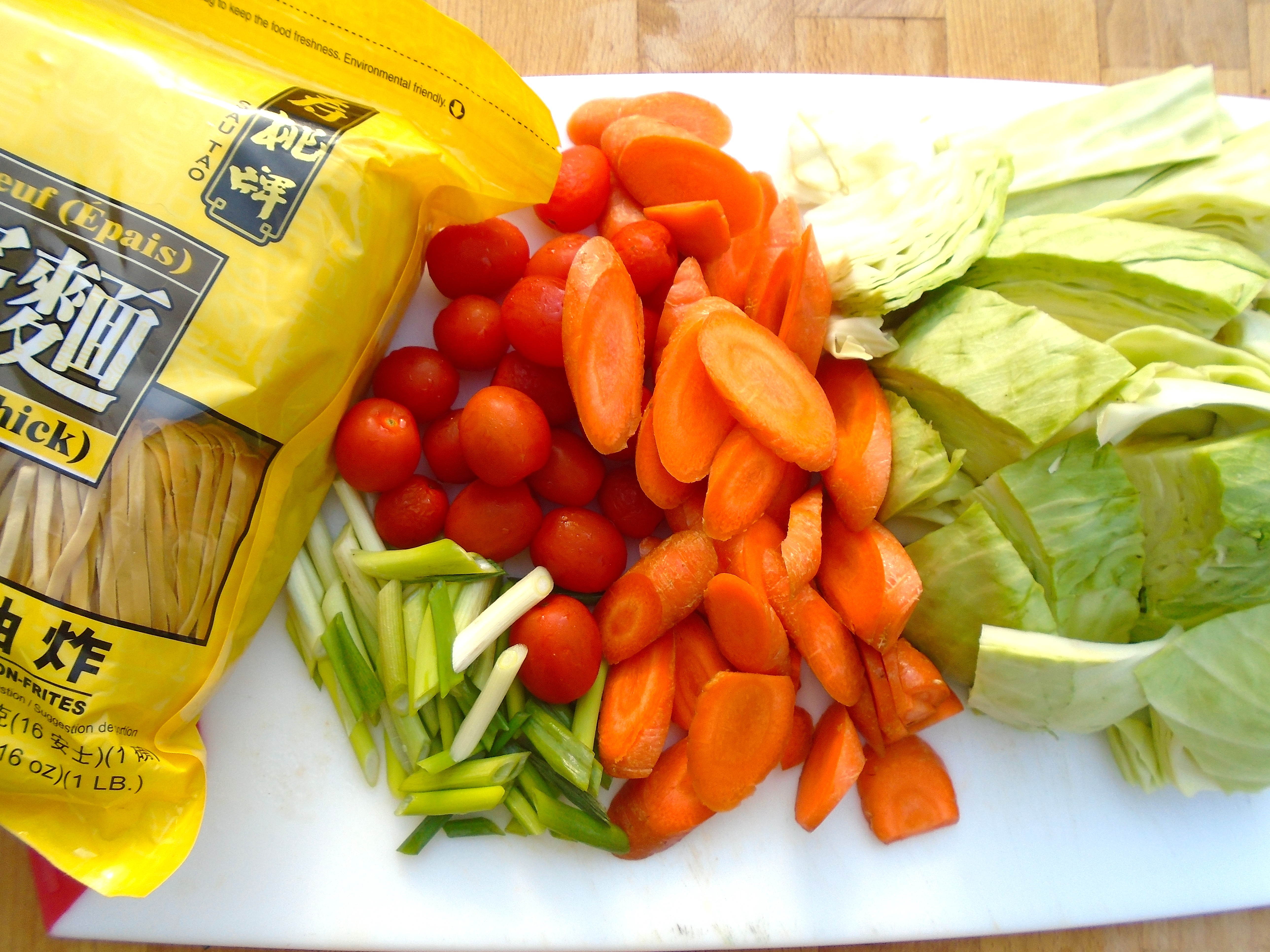 Chicken, Noodle & Vegetable Soup – Recipe # 1001 ← Previous Next → chinese egg noodles, grape tomatoes, carrots, cabbage, scallion