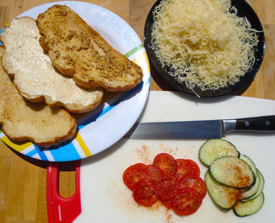 Swiss Melt On Sourdough Bread With Cucumber And Tomato ← Previous Next → slice 1/2 medium-size cucumber and 2 small vine-ripened tomato thinly, season to taste with kosher salt and cayenne pepper