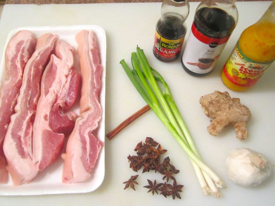 Braised Pork Belly In Ginger, Garlic & Soy Next → 2 lbs pork belly cut into cubes, 1 stick cinnamon, star anis to taste, 1/2 cup soy sauce, 1 tsp sesame oil, 1 tsp garlic paste, 1/3 tsp grated ginger, 2 cup water, 3 ea sliced scallion (plus more for garnish), kosher salt and chili sauce to taste