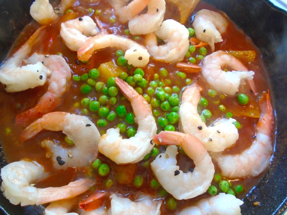 Portuguese Eggs ← Previous Next → add the shrimp and 3 oz green peas to the tomatoes, mix, check/adjust seasoning
