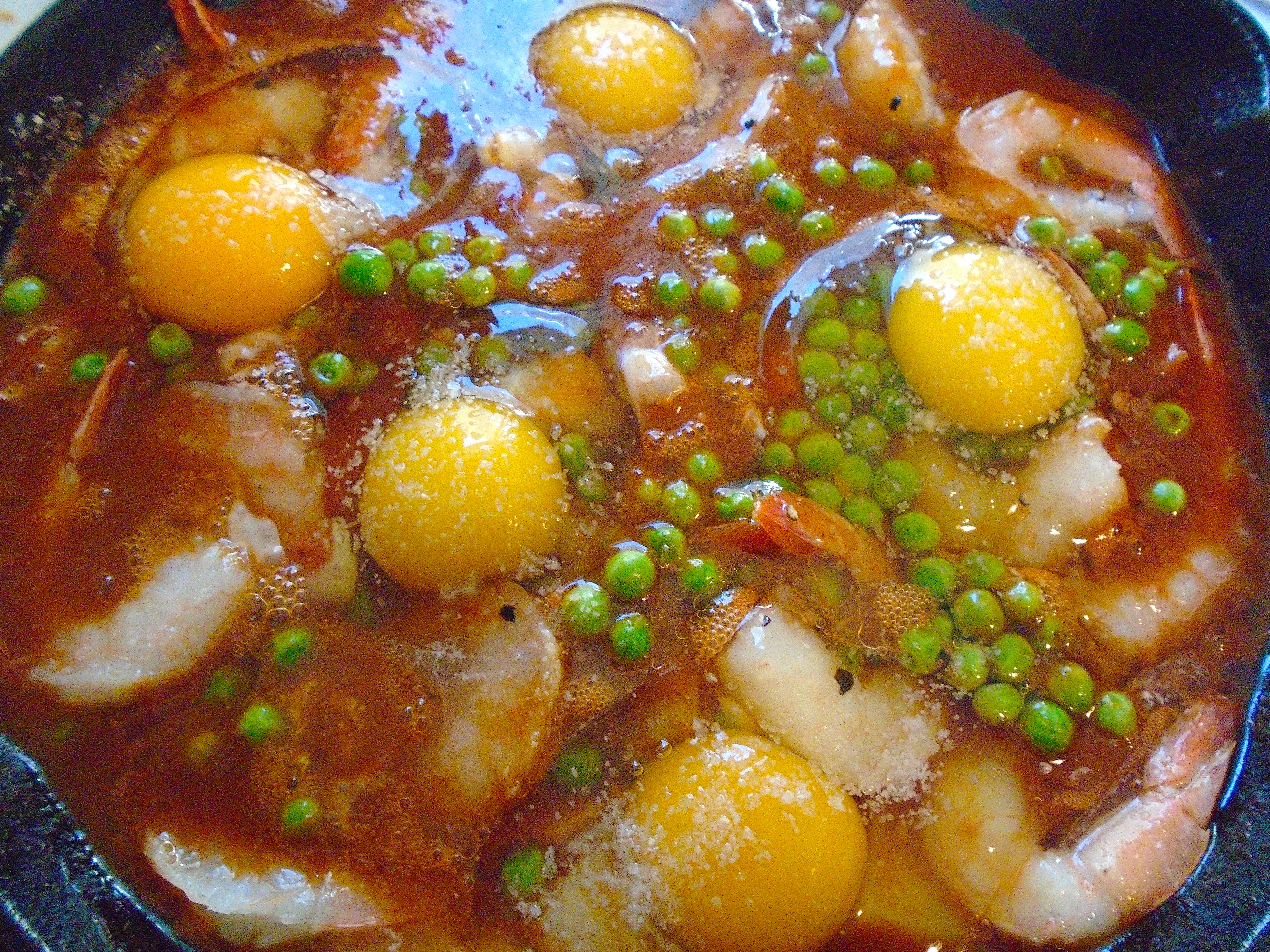add whole eggs to the stew, sprinkle eggs with kosher salt, simmer slowly until eggs are cooked the way you like them; if you like your eggs more cooked than I do, put them under the broiler for a couple of minutes, ; to serve, sprinkle with herbs of your choice; serves 4 or 5