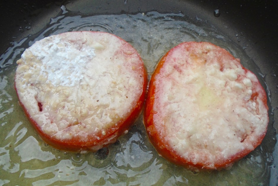 dust tomato slices with a/p flour, saute in duck fat until golden