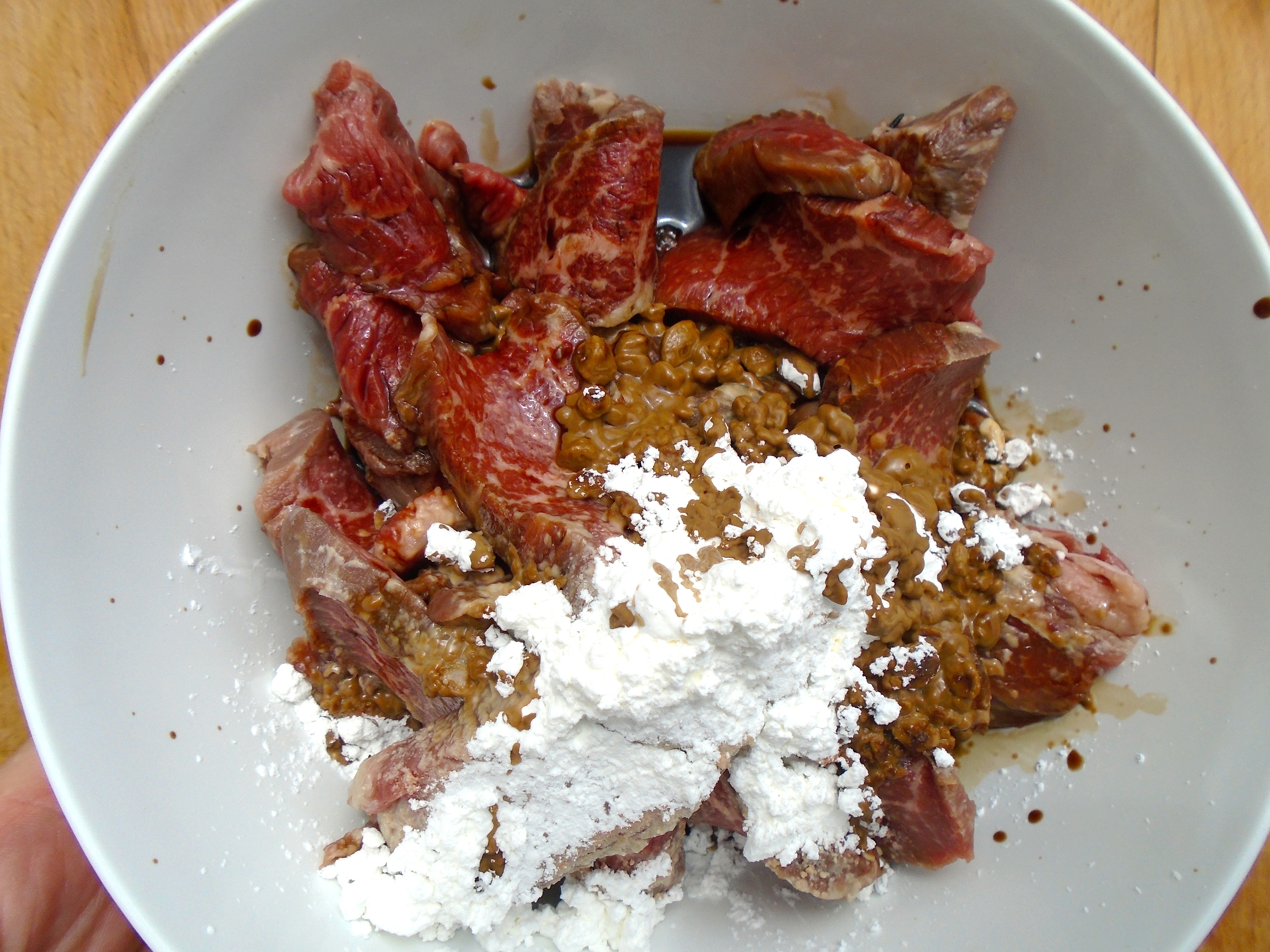 Mongolian Beef ← Previous Next → season beef with 2 tblsp cornstarch, 2 tblsp soy sauce, white pepper to taste
