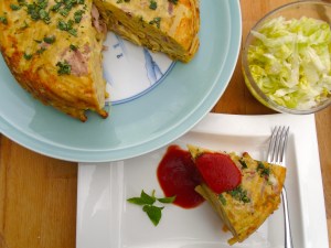 - mix 6 whole medium size eggs with 2 cup sauce mornay