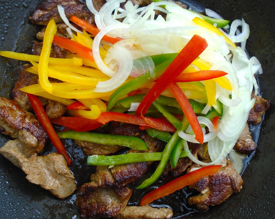 WhatAPig – Pork & Peppers On Baguette ← Previous Next → add 1/2 medium size red pepper 1/2 med size green pepper and 1/2 med size onion, all cut into fine julienne, season veggies with salt and pepper to taste, saute until heated through