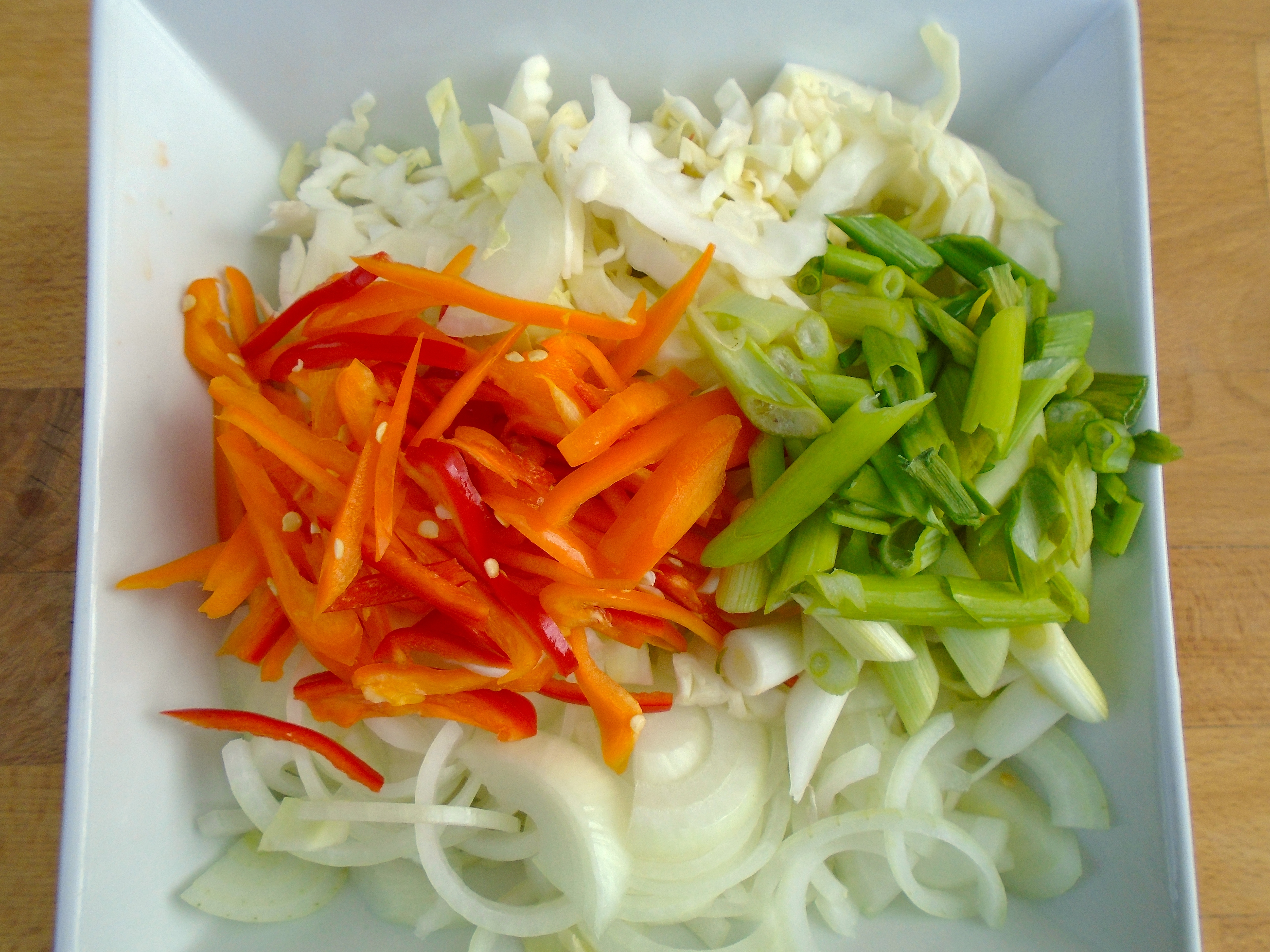 Singapore Noodles Next → julienne of 1 medium onion, 1/2 small head white cabbage, 2 ea medium-hot chilies, 3 stalks scallion