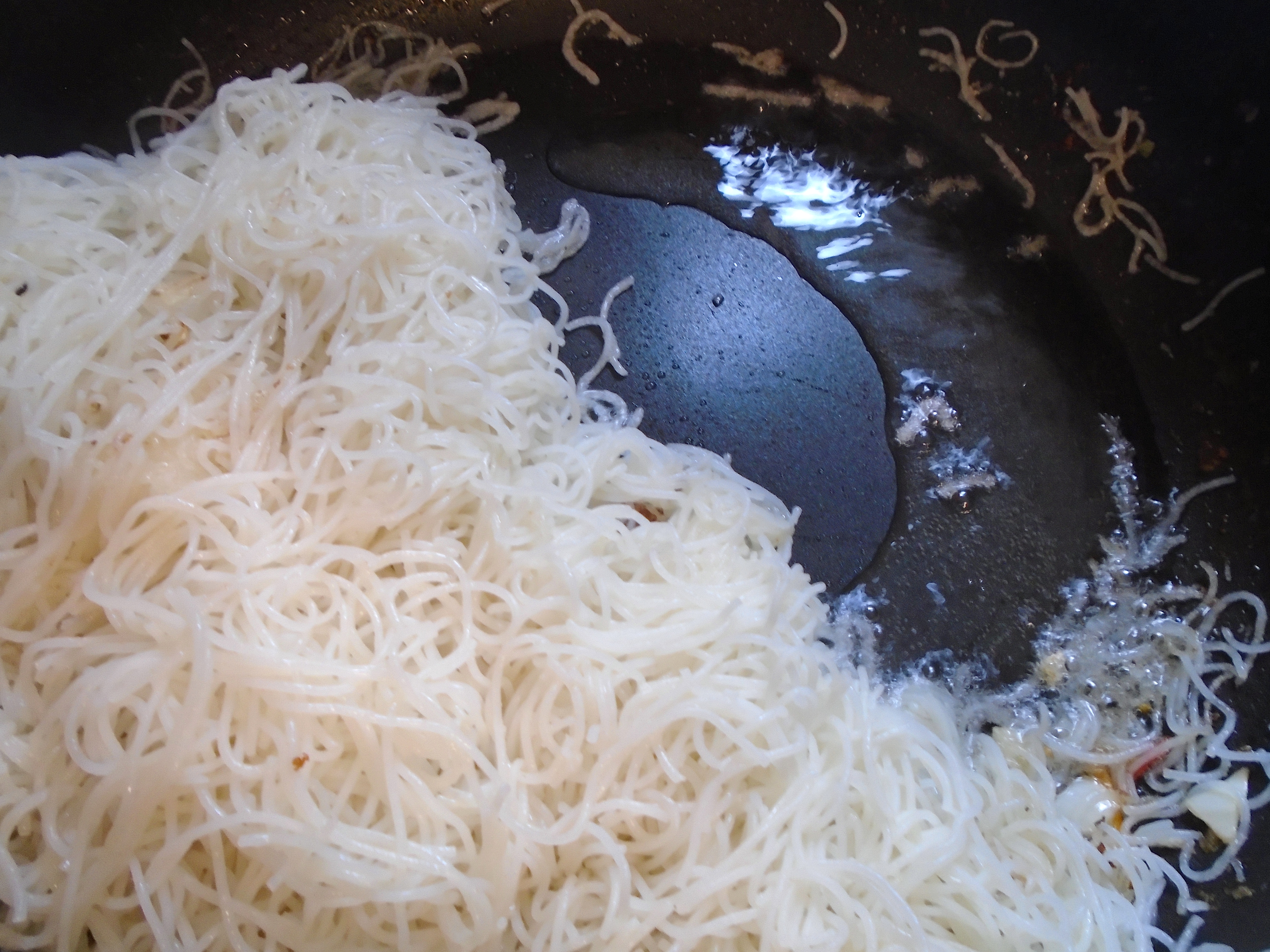 Singapore Noodles ← Previous Next → move rice sticks to one side of the pan, add 1 tblsp peanut oil to the empty side of the pan