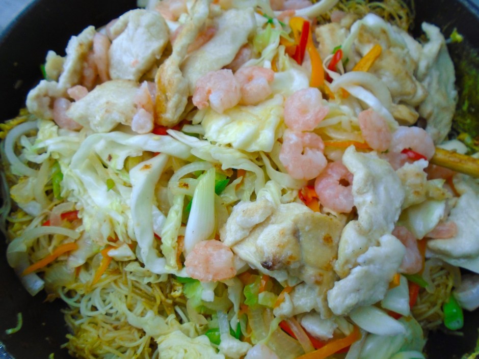 Singapore Noodles ← Previous Next → return the veggies, shrimp and chicken to the pan, add the seasoning/sauce, stir fry until all is well mixed