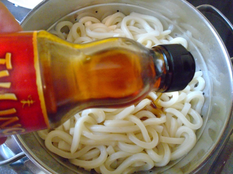 Lazy Udon ← Previous Next → cook 8 oz fresh udon noodles until done but still chewy, drain, toss with 1 tblsp sesame oil