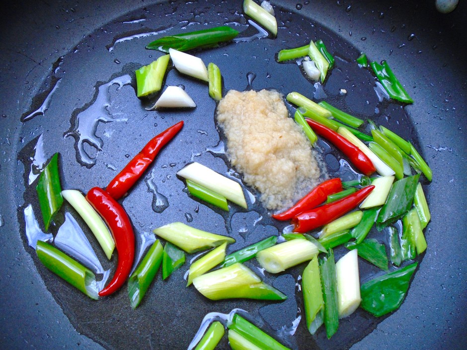 Lazy Udon ← Previous Next → stir fry 1/2 tblsp garlic paste in 1 tblsp peanut oil until fragrant, add 5 ea whole chilies and 3 ea sliced scallions, stir fry another minute