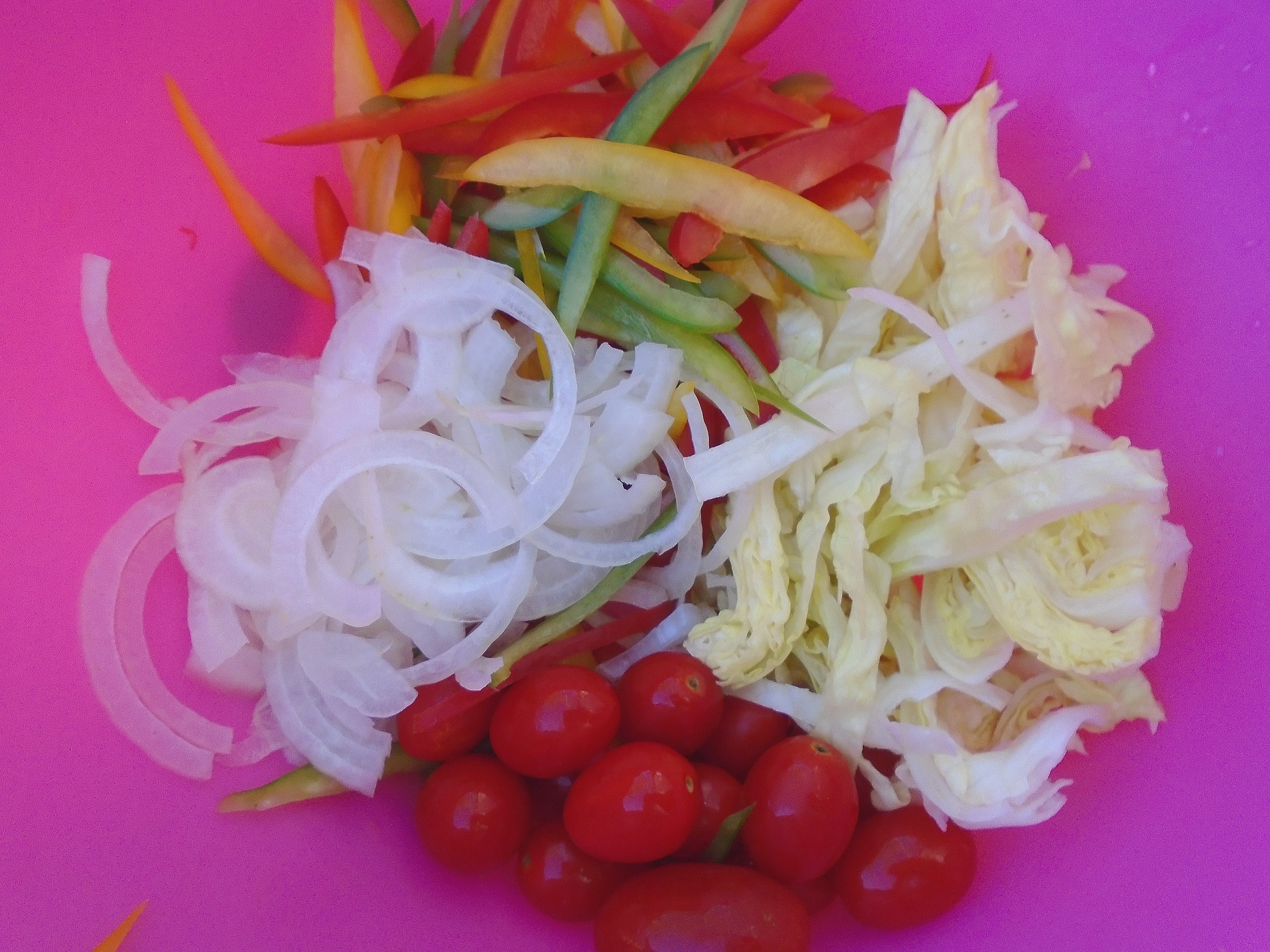 Grilled Chicken Salad ← Previous Next → add 1 cup tightly packed julienned white cabbage,1 cup tightly packed julienned white onions and 1 cup grape tomatoes, dress with 1/3 cup ranch dressing