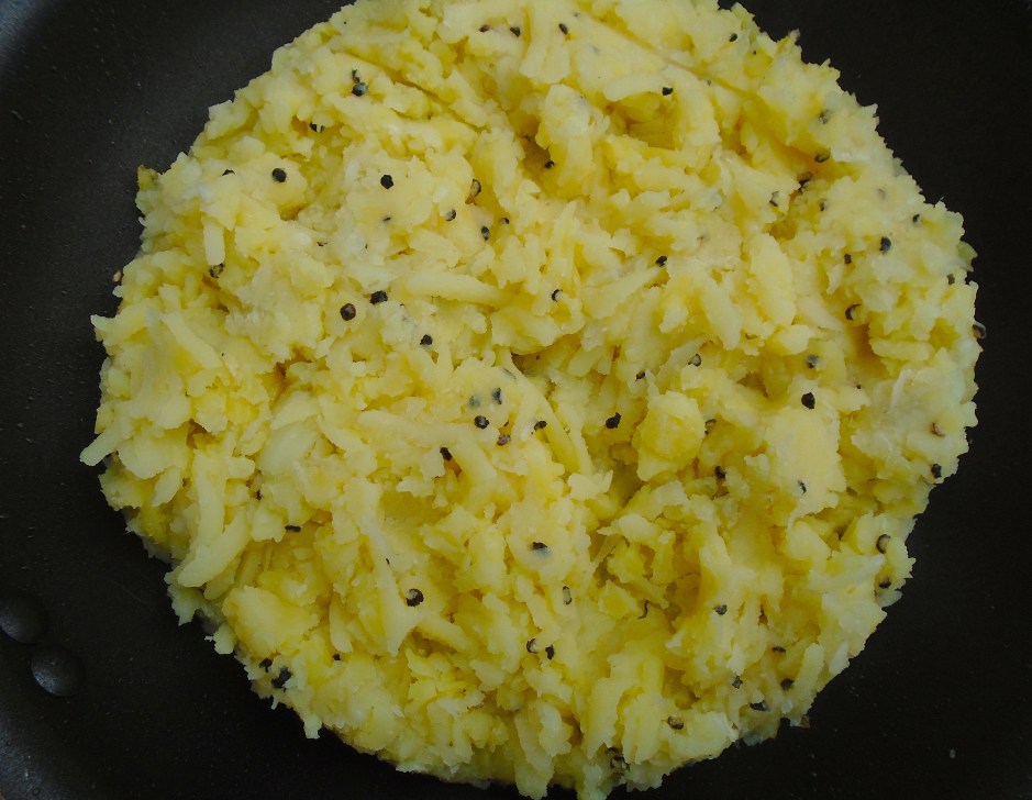 Cheese Rösti (Swiss Hash Browns With Cheese) ← Previous Next → add 2 tblsp vegetable oil to a medium-hot pan, spread 1/2 of the potatoes evenly, saute until bottom is golden and crisp
