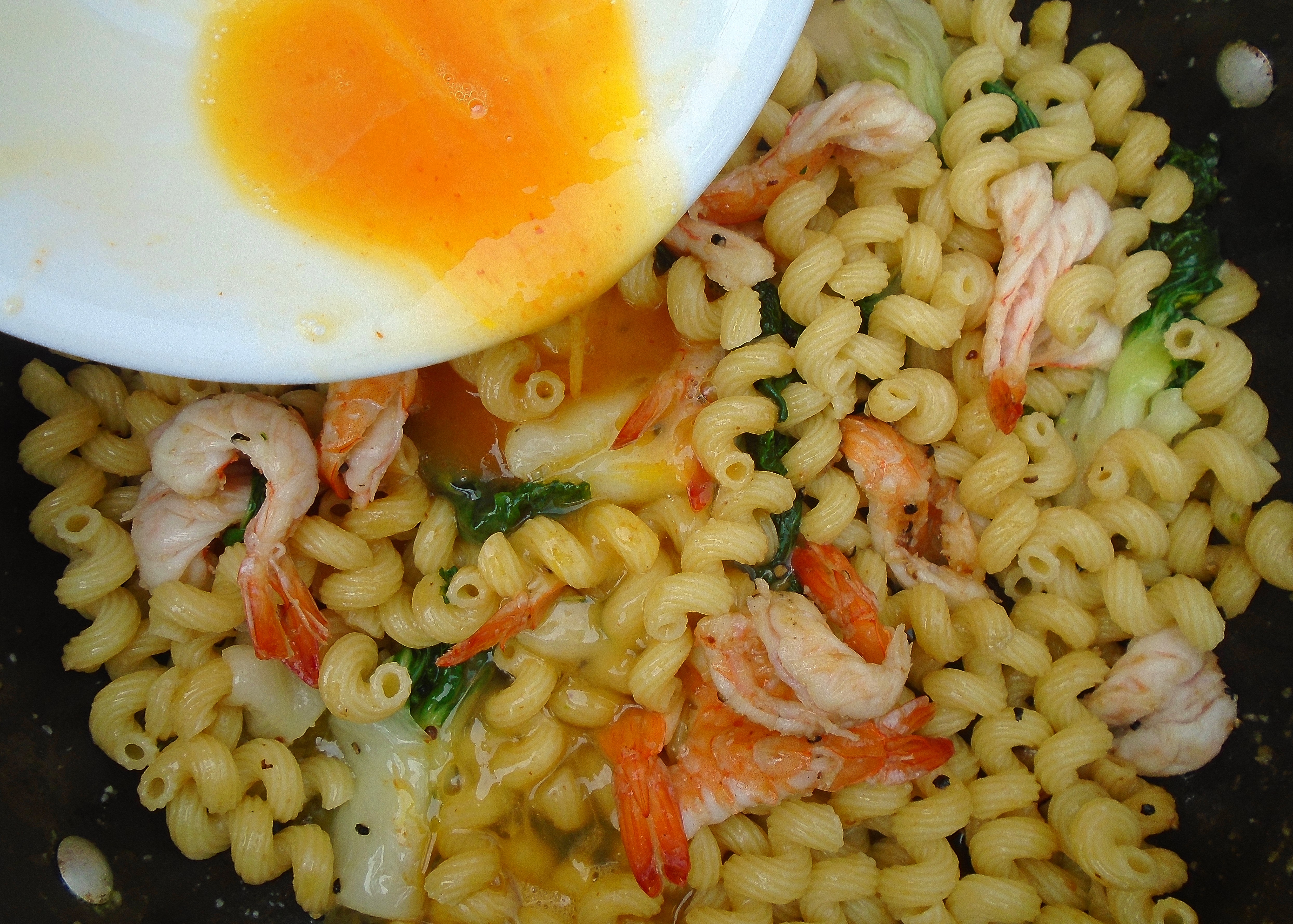 Corkscrews, Shrimp, Bok Choy and Eggs ← Previous Next → add 4 whole whisked eggs, seasoned with kosher salt and cayenne pepper to taste, cook until eggs have set but are still moist; serves 2