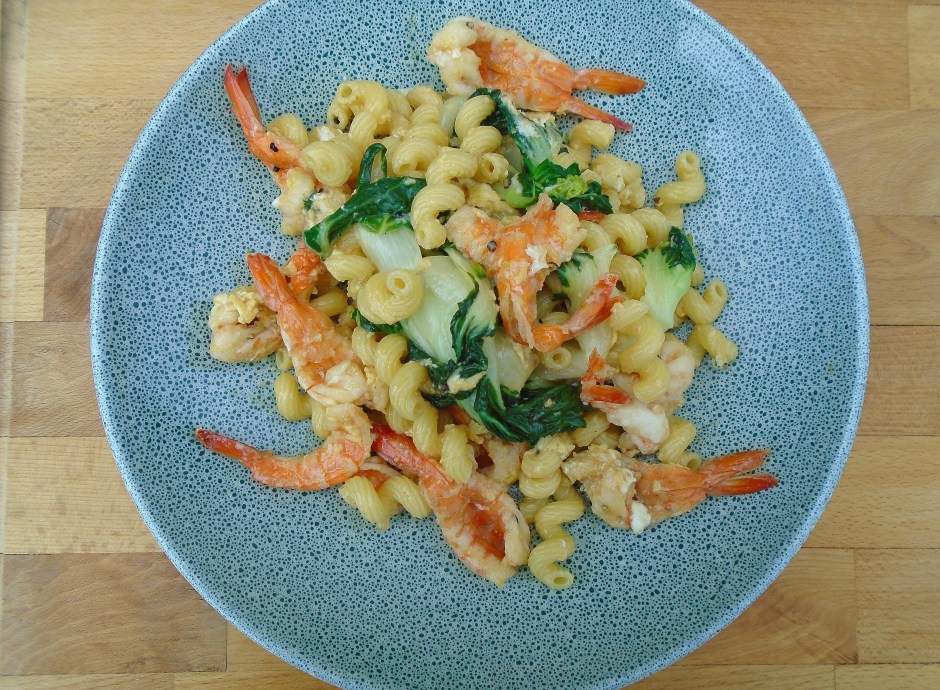 Corkscrews, Shrimp, Bok Choy and Eggs