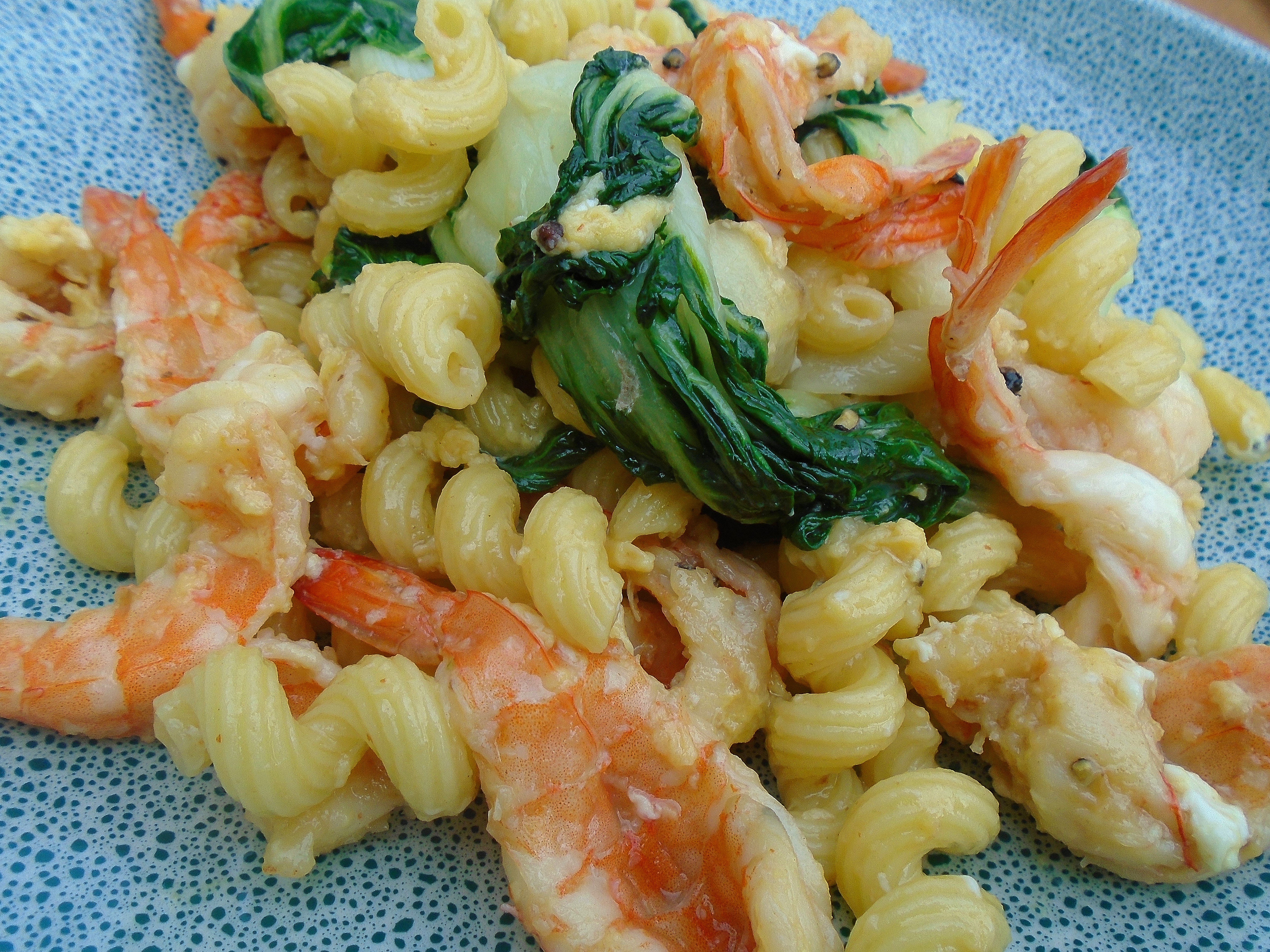Corkscrews, Shrimp, Bok Choy and Eggs