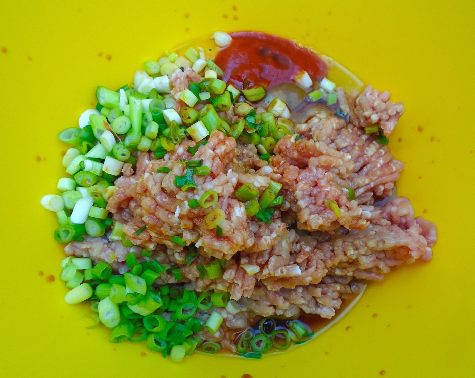 Pearl Balls Burgers ← Previous Next → mix 2 lbs ground pork, 4 ea stalks sliced scallions, 1 tblsp sesame oil, 1 tblsp soy sauce, 1 tsp garlic paste, 1/2 tsp grated ginger, 1 tsp chili paste, kosher salt to taste and 1 cup water or unsalted chicken broth