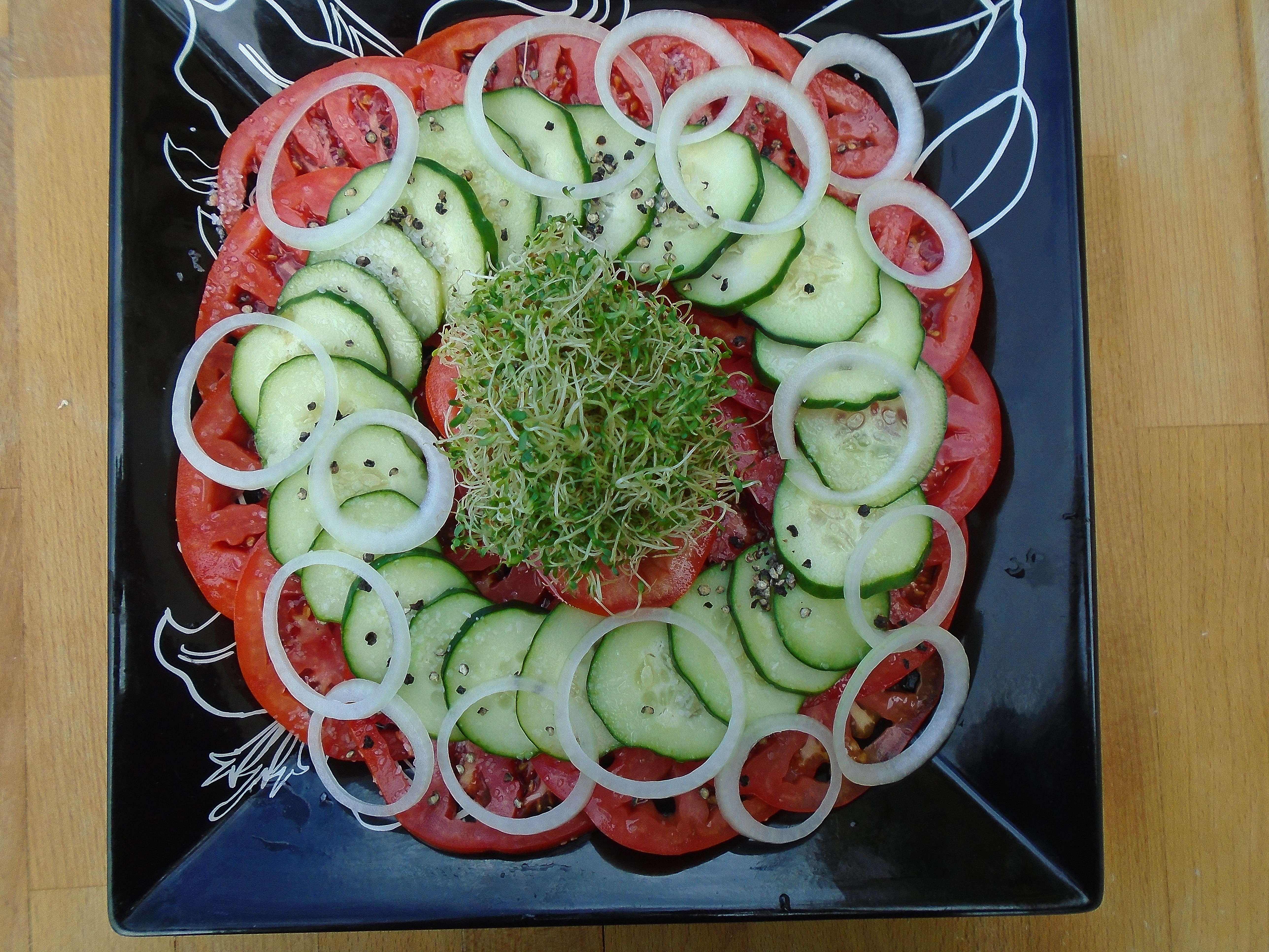 slice 2 large, very ripe tomatoes and 1 medium size white onion into fine slices, arrange on serving platter, sprinkle with sea salt and fresh-cracked black pepper to taste, add 1/2 tray alfalfa sprouts, drizzle with 3 tblsp white balsamic vinegar and 3 tblsp olive oil