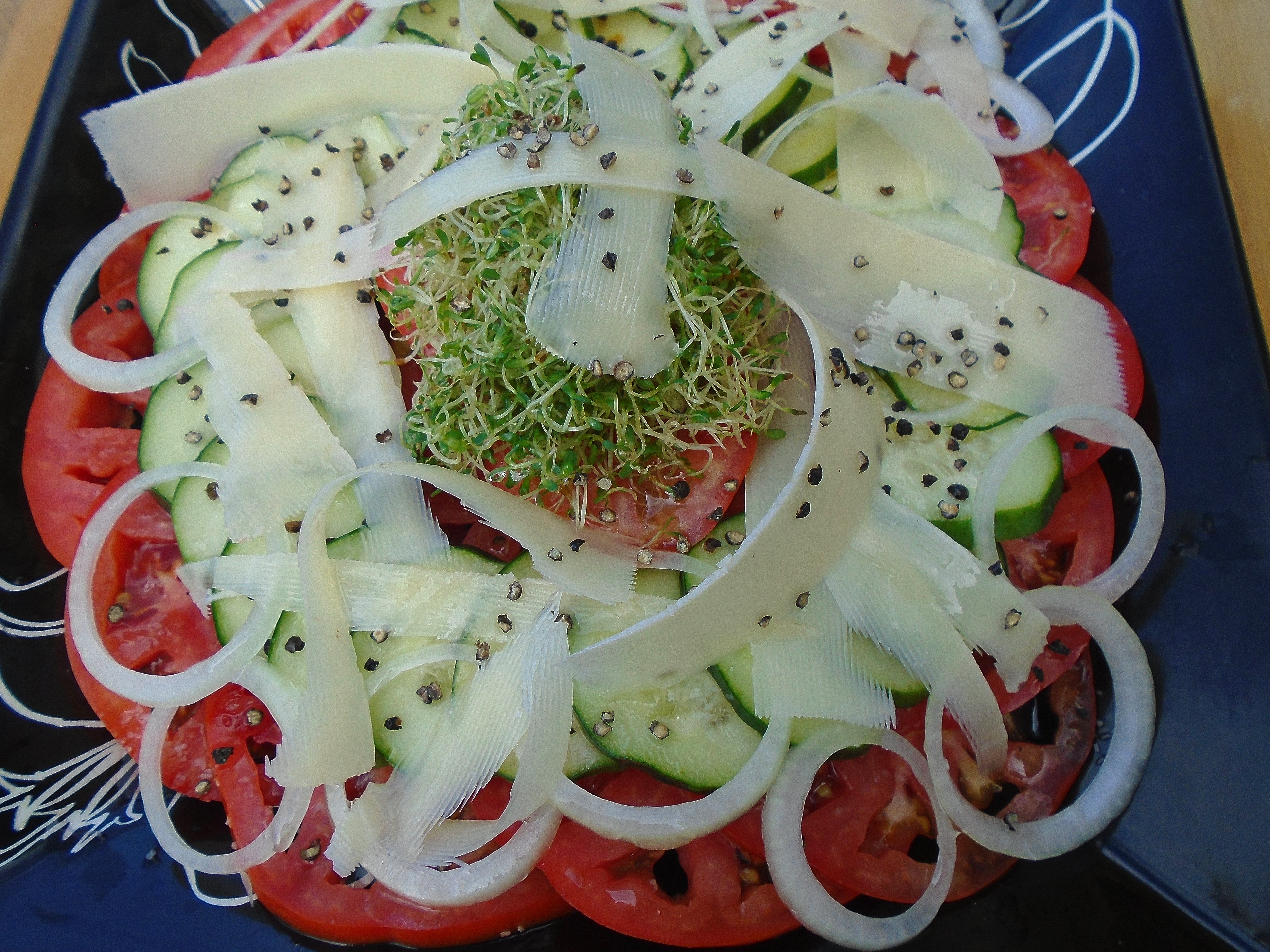 Salad of Tomato, Cucumber, Alfalfa Sprouts And Parmigiano Reggiano ← Previous Next → shave 6 oz of parmigiano reggiano on top of salad, drizzle with 2 tbslp olive oil and sprinkle with fresh-cracked black pepper to taste