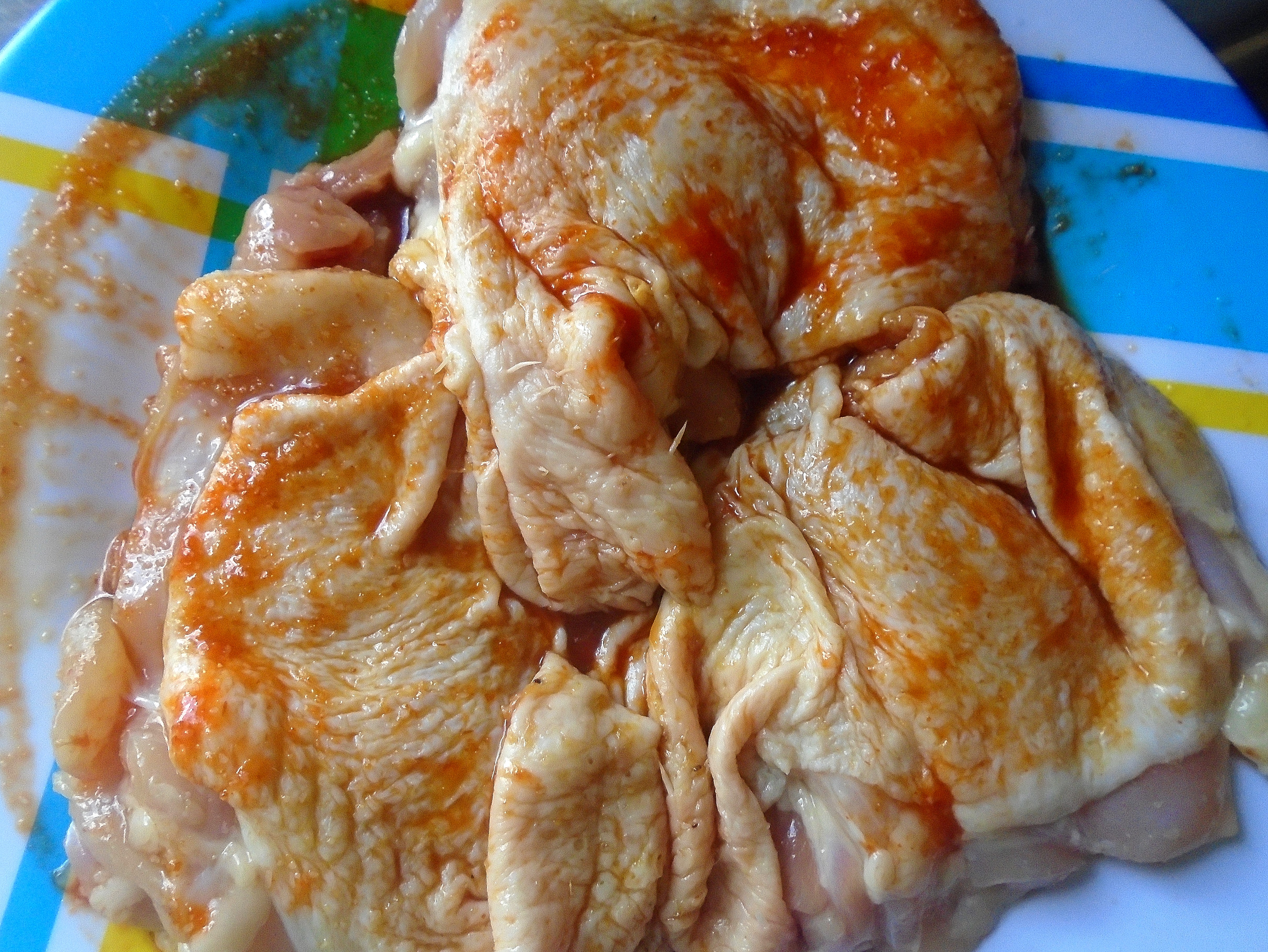BraisedTeriyaki Chicken With Spicy Rice Sticks Next → season 3 ea boneless chicken legs with kosher salt, garlic paste and sriracha sauce to taste