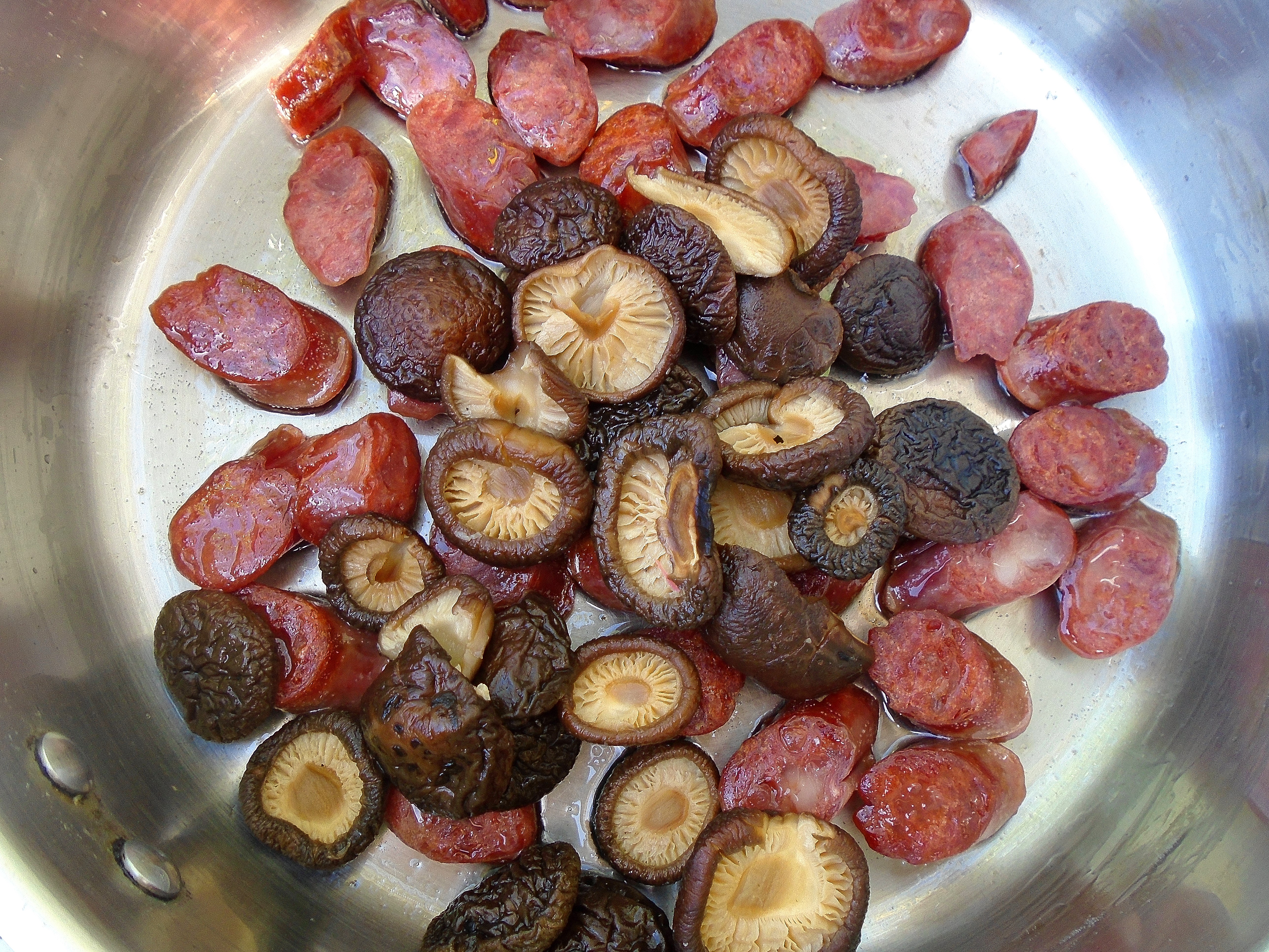 No Name Soup ← Previous Next → stir fry 6 oz sliced chinese sausages and 4 oz fresh shiitake mushroom in 1 tblsp peanut oil until sausage starts to brown at the edges